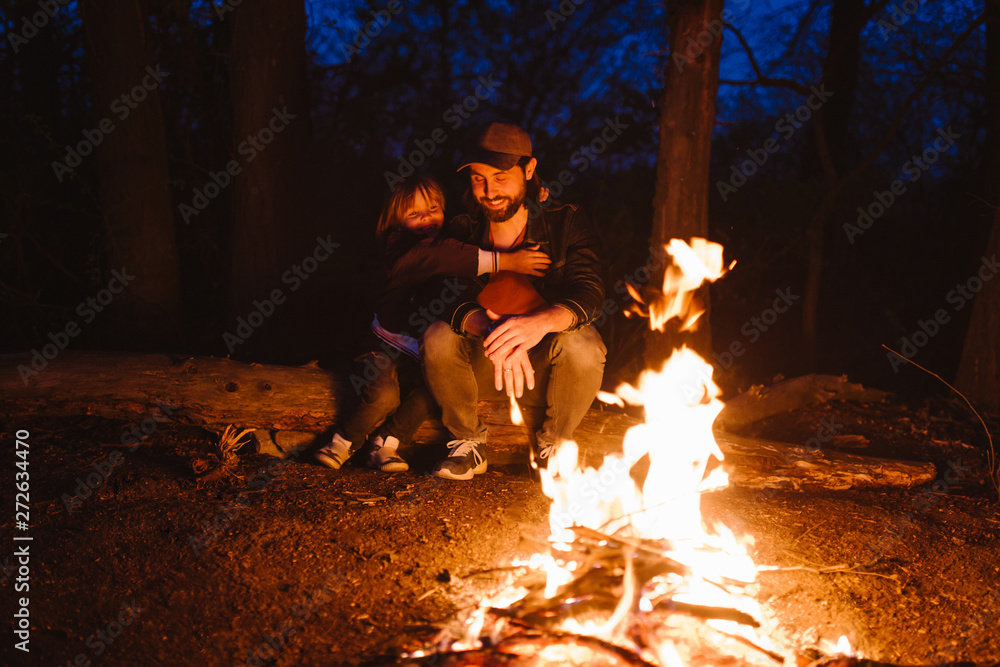 Father and his little son sitting together on the logs in front of a fire at the night. The hike in the forest.
