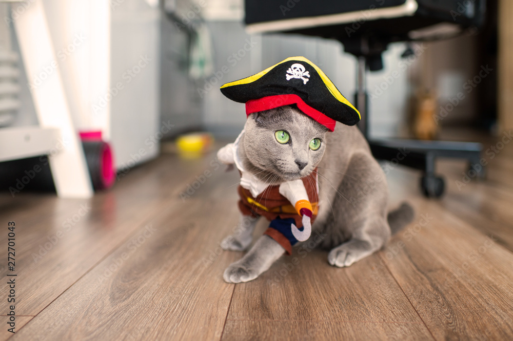 Lovely kitten in pirate costume. Funny cat in mask. Pet clothes concept.