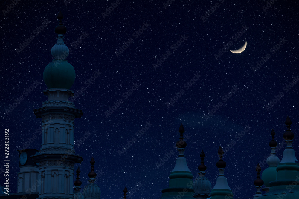 Top of mosque in Eid Ul fitr night with moon and star in sky