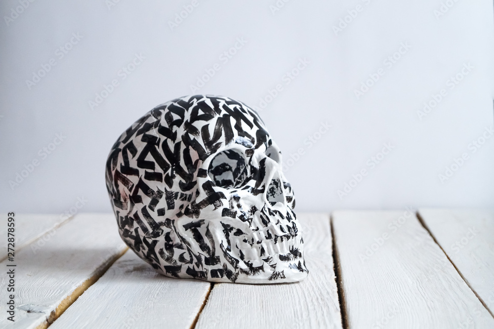 skull on the white wall and wood background