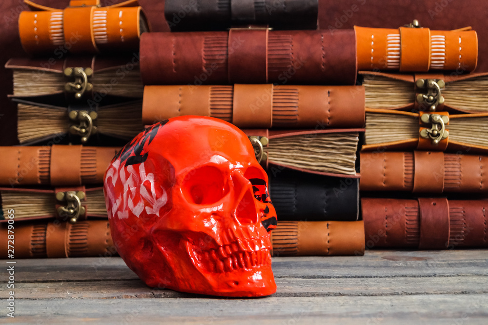 skull on the leather journal book background