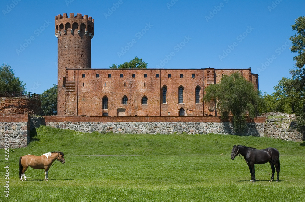 Konie na tle zamku krzyzackiego w Świeciu, Polska