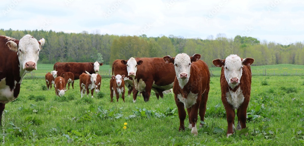Hereford cows with newborn calves in the meadow