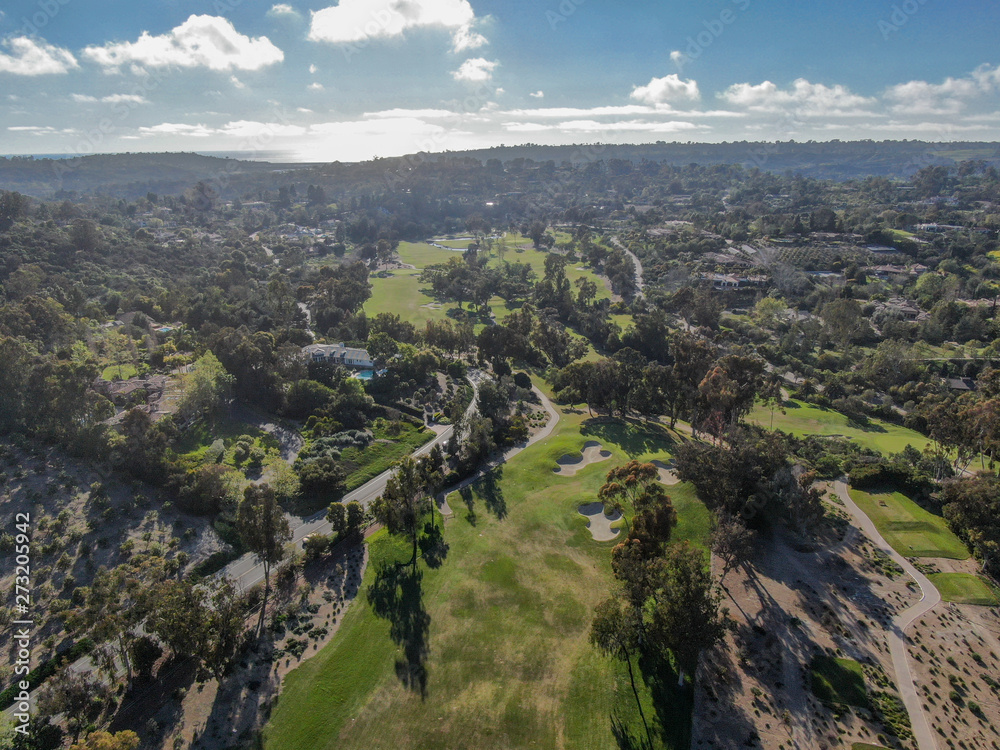 Aerial view of a beautiful wealthy green golf course next the valley. San Diego, California. USA.