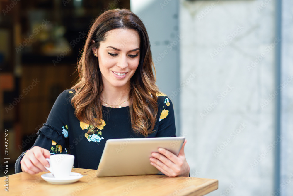 Middle-aged woman using tablet on coffee break in urban cafe bar.