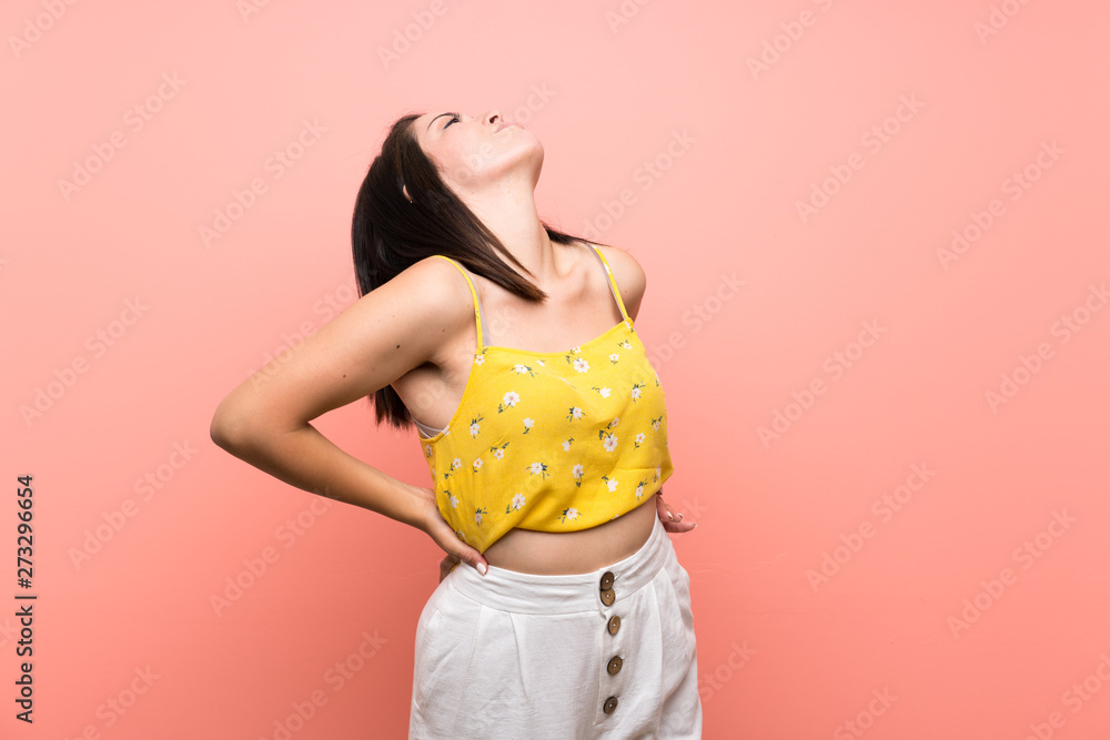 Young Mexican woman over isolated wall suffering from backache for having made an effort
