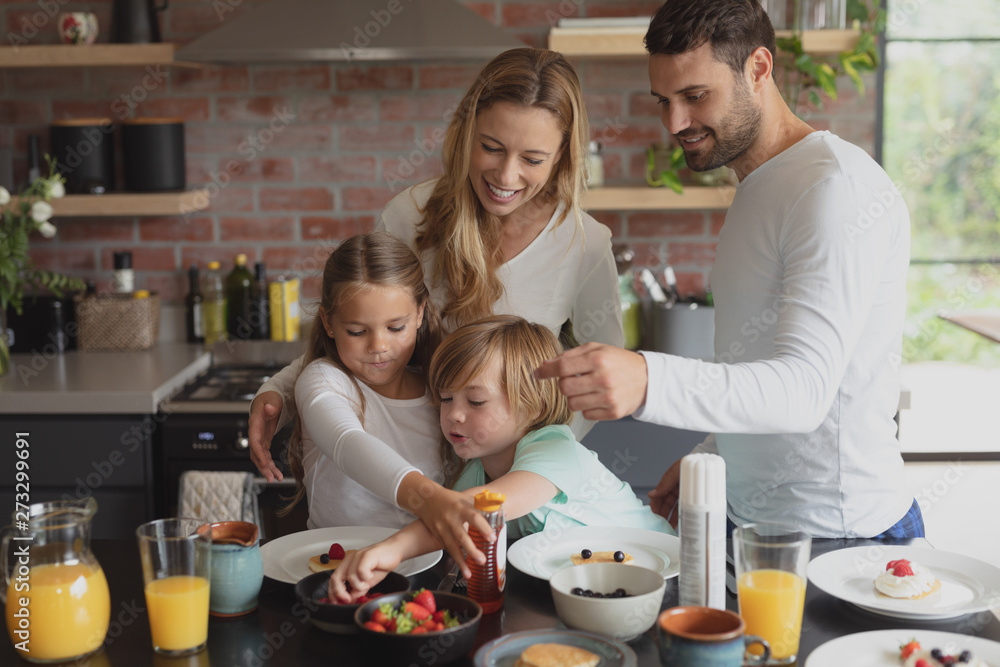 Caucasian family having food at dining table
