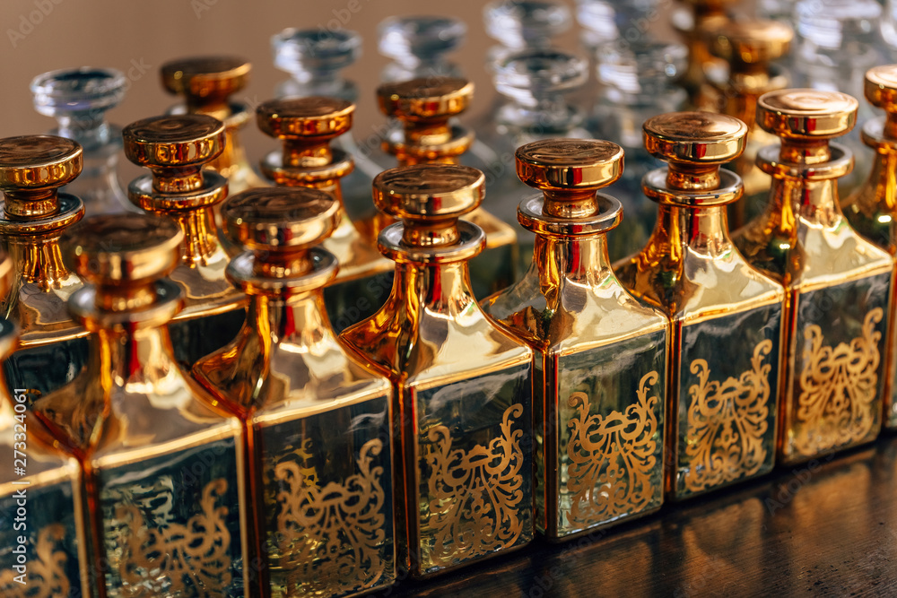 Golden glass bottle with perfumowana oils. Decorative containers for oils and perfume. Glass bottle.