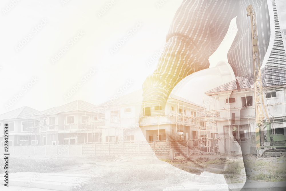 Construction engineer worker hold helmet double exposure with residential new house in progress at building site
