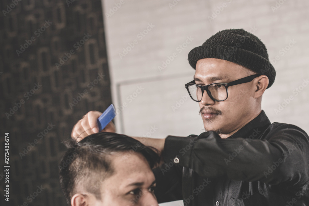 Portrait of barber hairstyle a costumer hair with hand and pomade in barbershop or salon