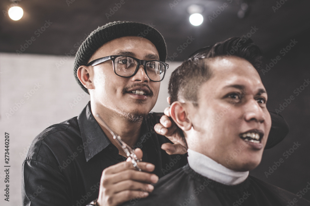 Portrait of barber hairstyle a costumer hair with hand and pomade in barbershop or salon
