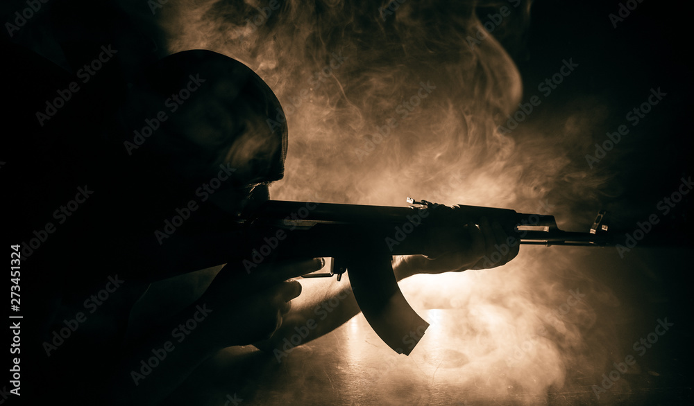 Silhouette of man with assault rifle ready to attack on dark toned foggy background or dangerous bandit holding gun in hand.