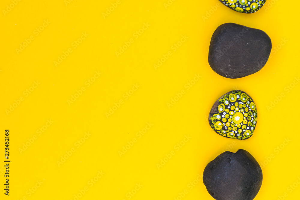 Painted with colored paint stones lie on a yellow background. There is a place for text. Concept art, ethnic culture.