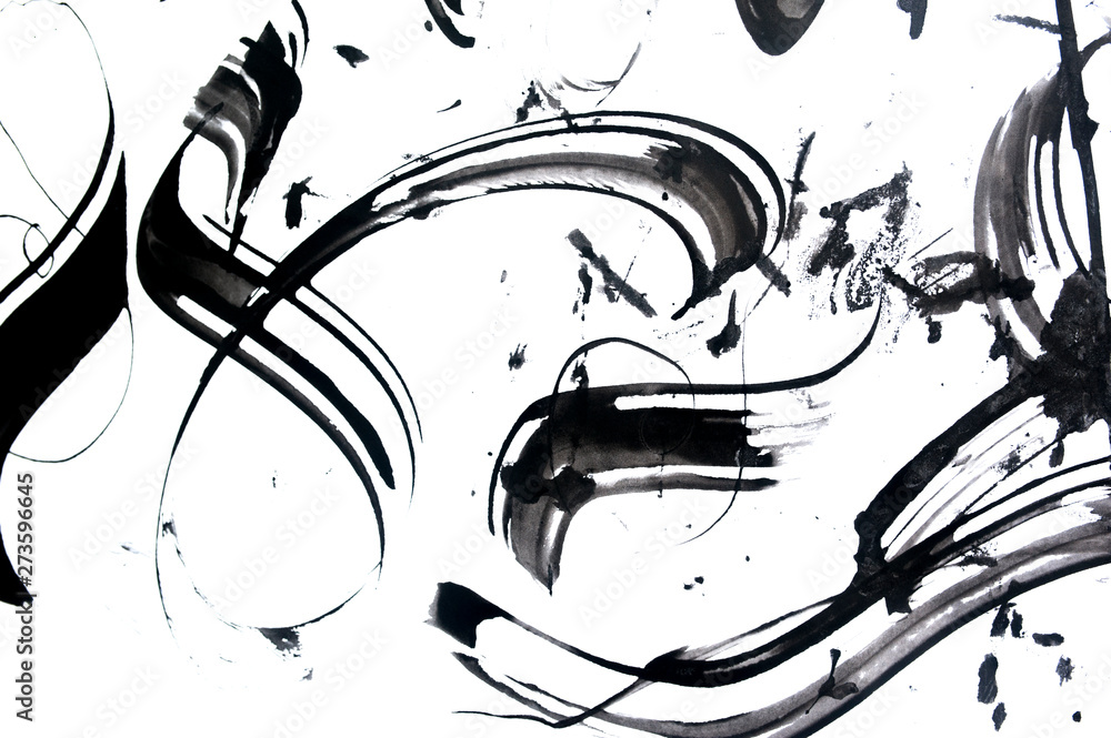 Abstract brush strokes and splashes of paint on paper. Grunge art hand draen calligraphy background