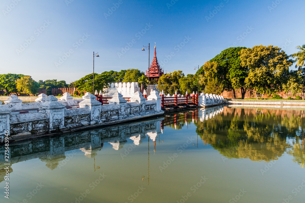 Moat, bridge, walls and a tower of Mandalay Fortress, Myanmar