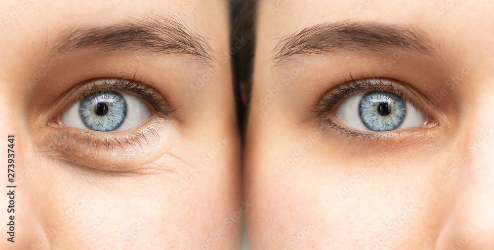 Before and after view of blepharoplasty surgery, plastic surgery of the eyes to remove puffy bags, a common symptom of sleep deprivation and stress.