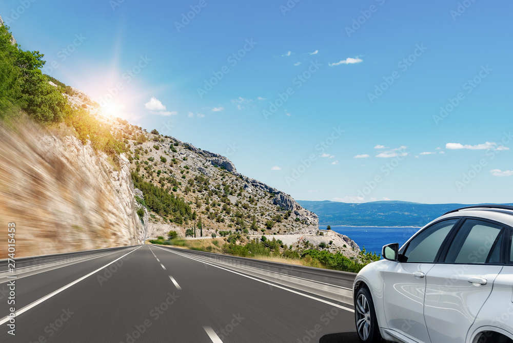 White car rushes along the road to the sea. Motion blur effect.