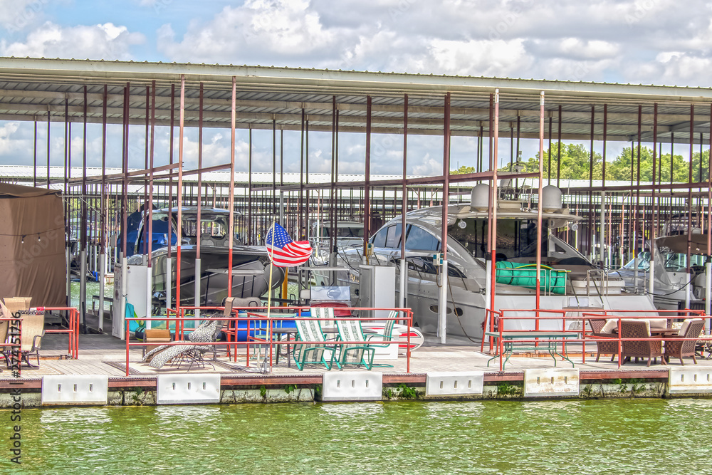 Party-boat covered dock on lake with expensive luxury speedboats docked and chairs and tables and toys for fun and guests in outside area
