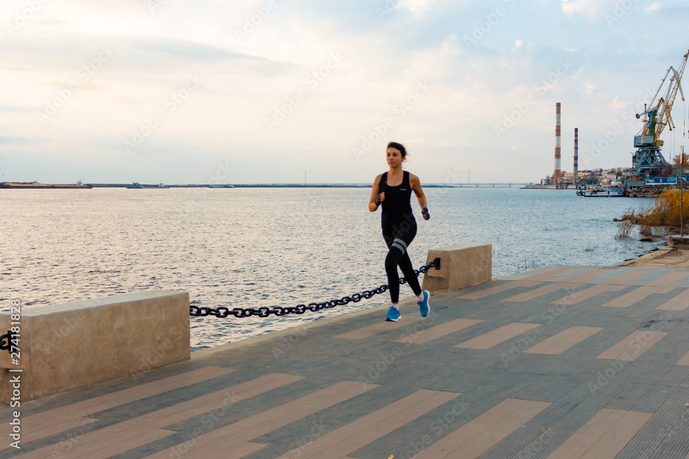 Khabarovsk, Russia - October 07, 2018: a young and attractive girl runs at sunset in a city Park. Healthy fitness woman running outdoors. Amur river in Khabarovsk horizon in the background.