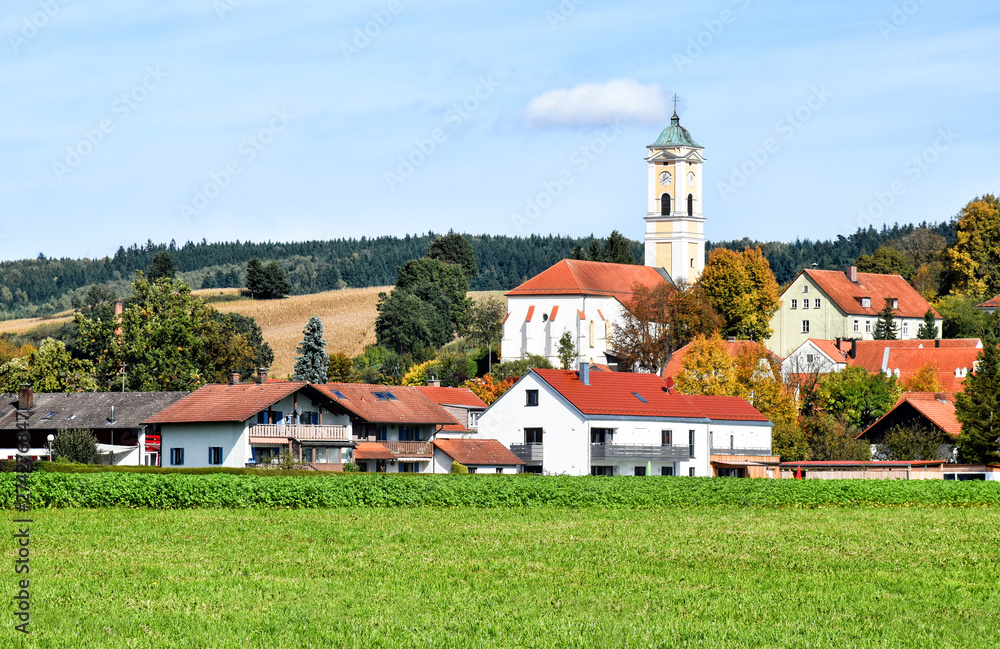 Cityscape of the Bavarian health resort Bad Birnbach with the late gothic parish church Maria Himmelfahrt (Germany)