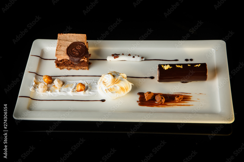 top view of tasty chocolate creamy dessert on rectangle plate