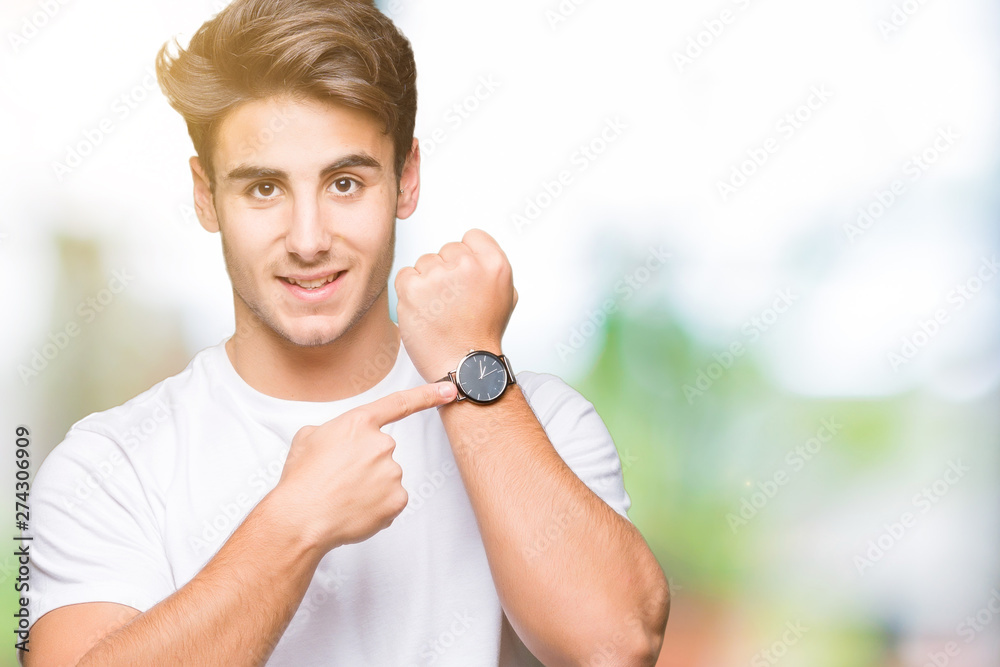 Young handsome man wearing white t-shirt over isolated background In hurry pointing to watch time, impatience, upset and angry for deadline delay