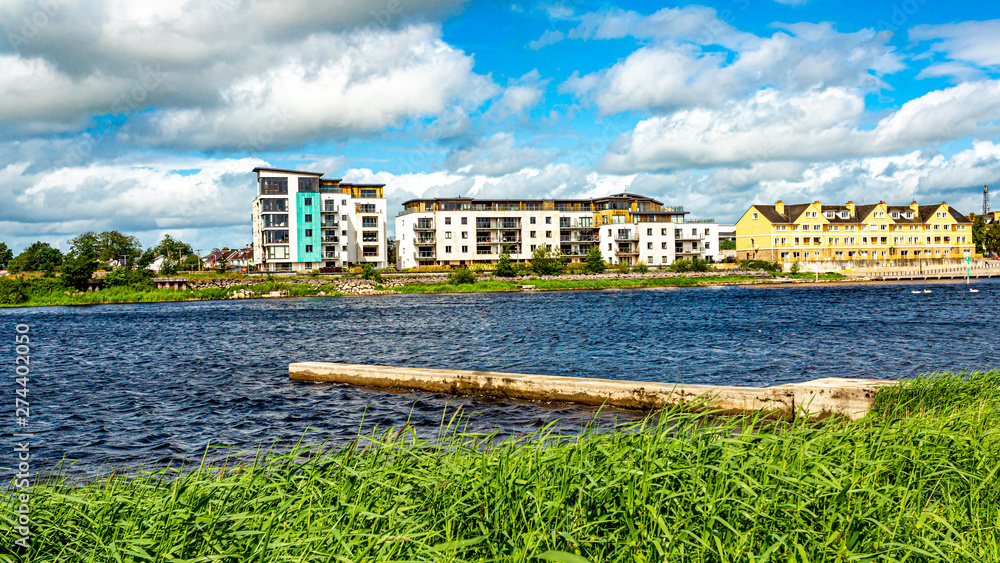 Shannon river with calm waters, some buildings in the city of Athlone in the background, wonderful spring day in the county of Westmeath, Ireland