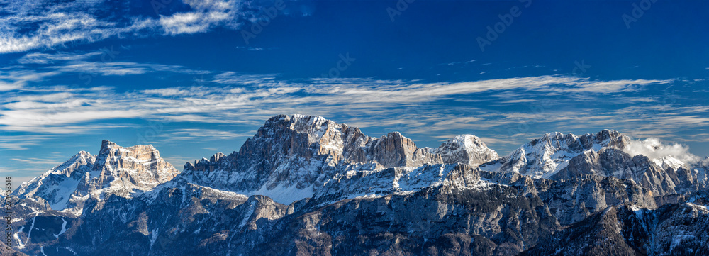 Panoramic view of snowy Dolomites mountains in Italy, Civetta ski resort and Monte Pelmo in background