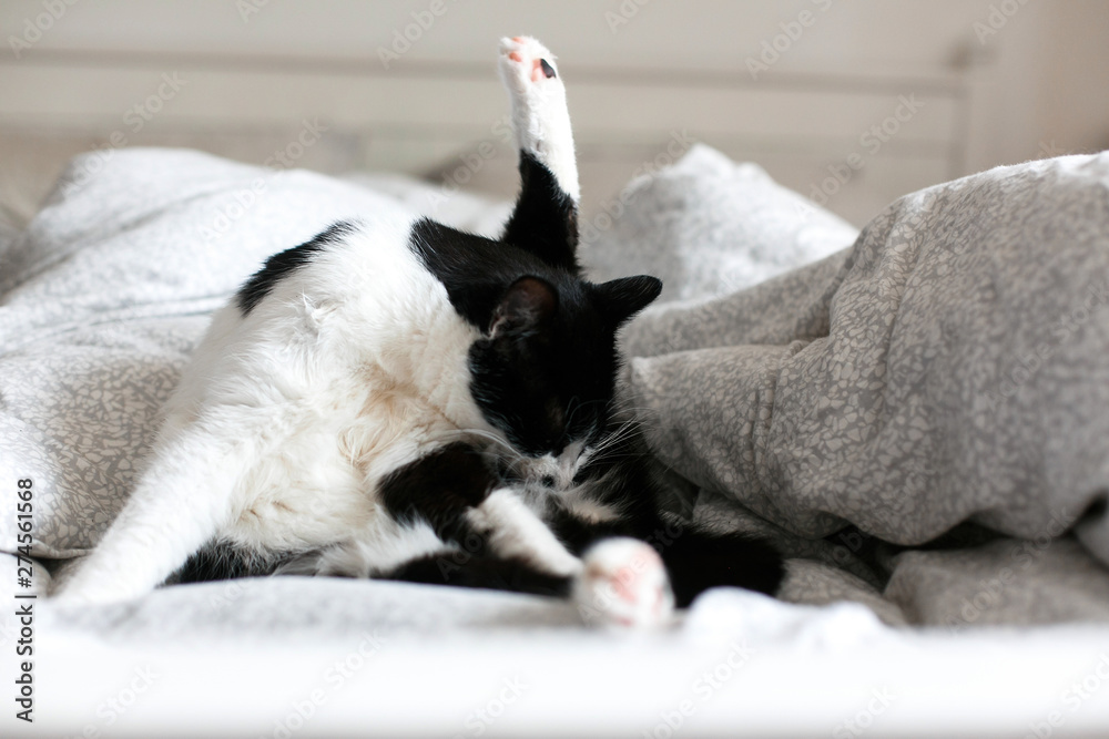 Cute cat with moustache grooming on bed. Funny black and white kitty licking and cleaning butt on stylish sheets. Space for text. Comfortable moment