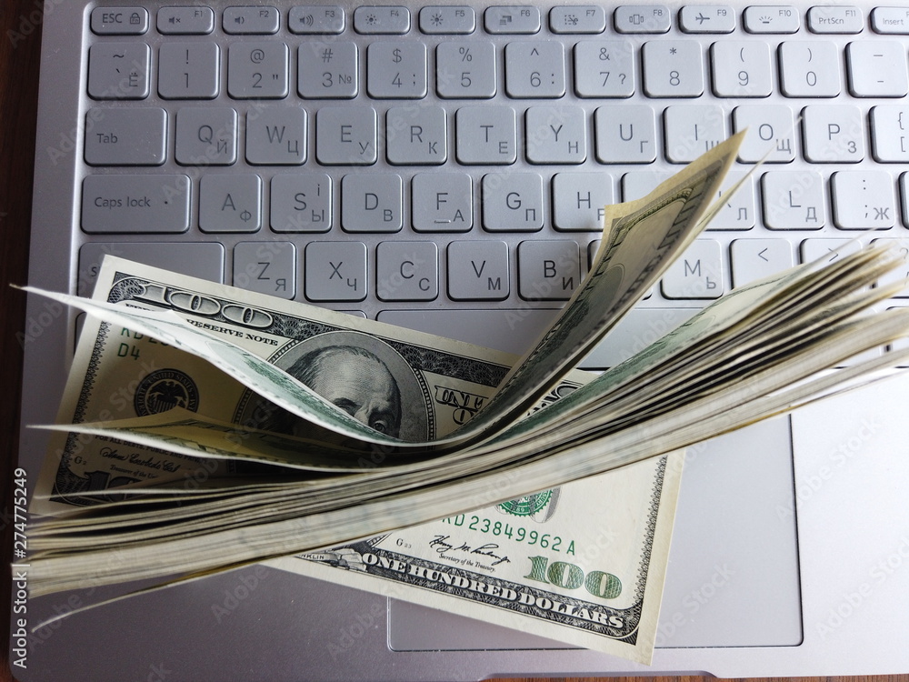 Stack of american dollars on laptop keyboard background. A lot of american dollars on the keyboard background.