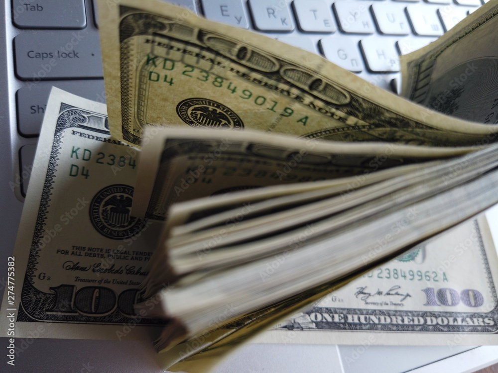 Stack of american dollars on laptop keyboard background. A lot of american dollars on the keyboard background.