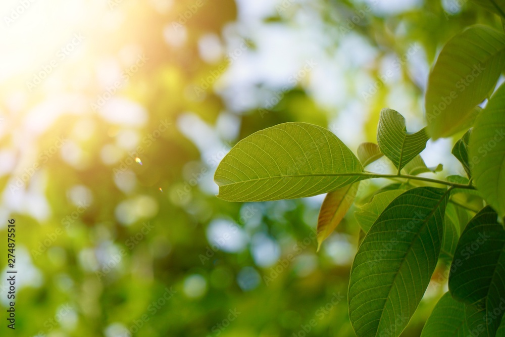 green tree leaves and branches in the nature in summer, green background