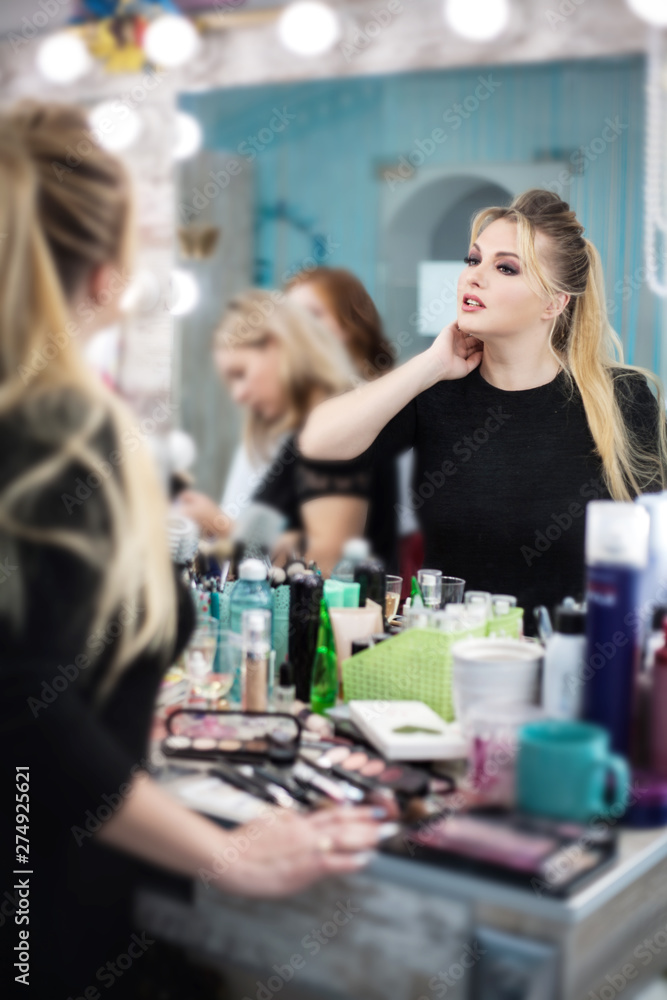 Woman in a beauty salon looks at her reflection in the mirror on her makeup and hairstyle.