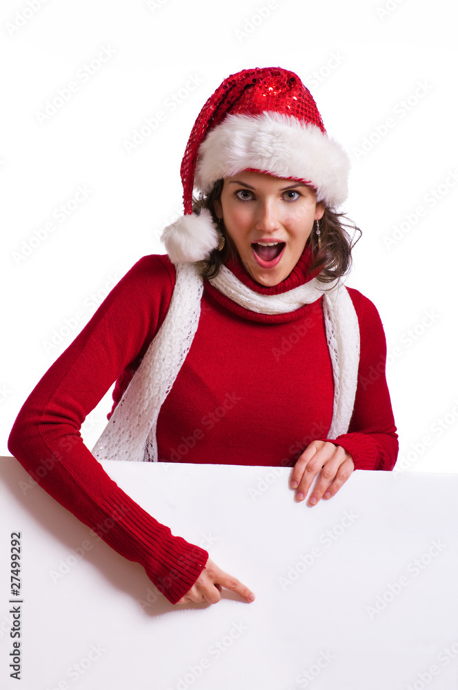 Frau mit Zipfelmütze zeigt auf Werbeschild