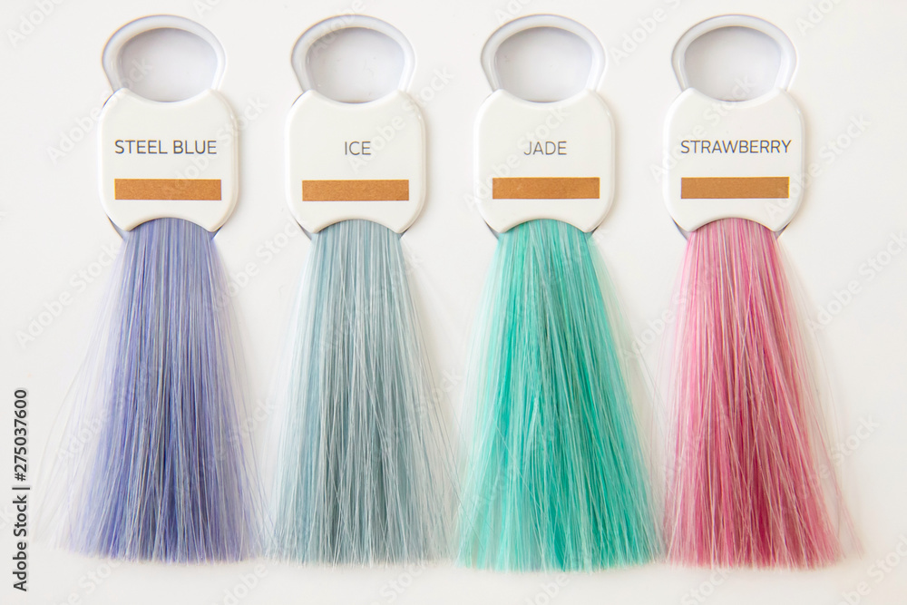 Hair palette dyed different colors. Hairstyle wig tints set for beauty industry