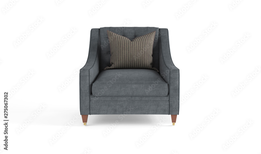 Classic modern gray armchair with wooden legs, quilted back with striped pillow isolated on white background. Furniture, interior object, stylish armchair. Single piece of furniture.