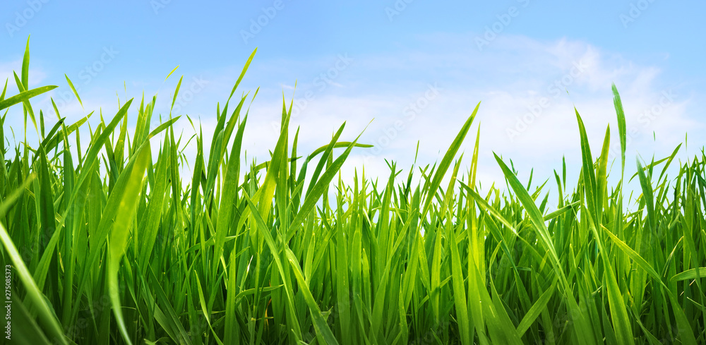Lush green young tall grass sways in the wind against the blue sky with clouds in nature outdoor, macro, wide format. Green shoots of cereals.