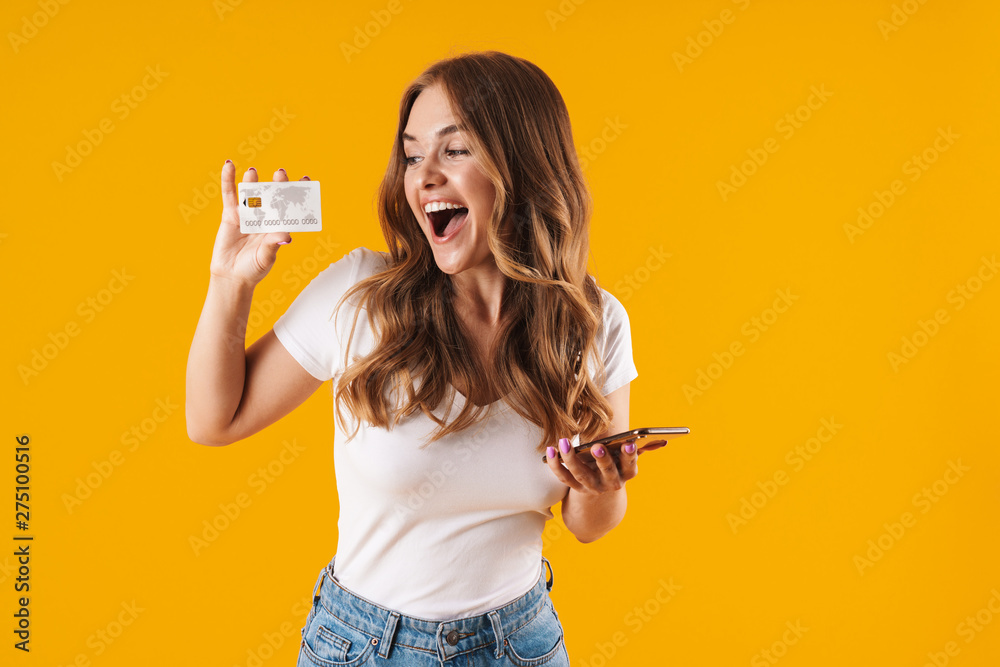 Photo of beautiful young woman rejoicing while holding credit card and smartphone