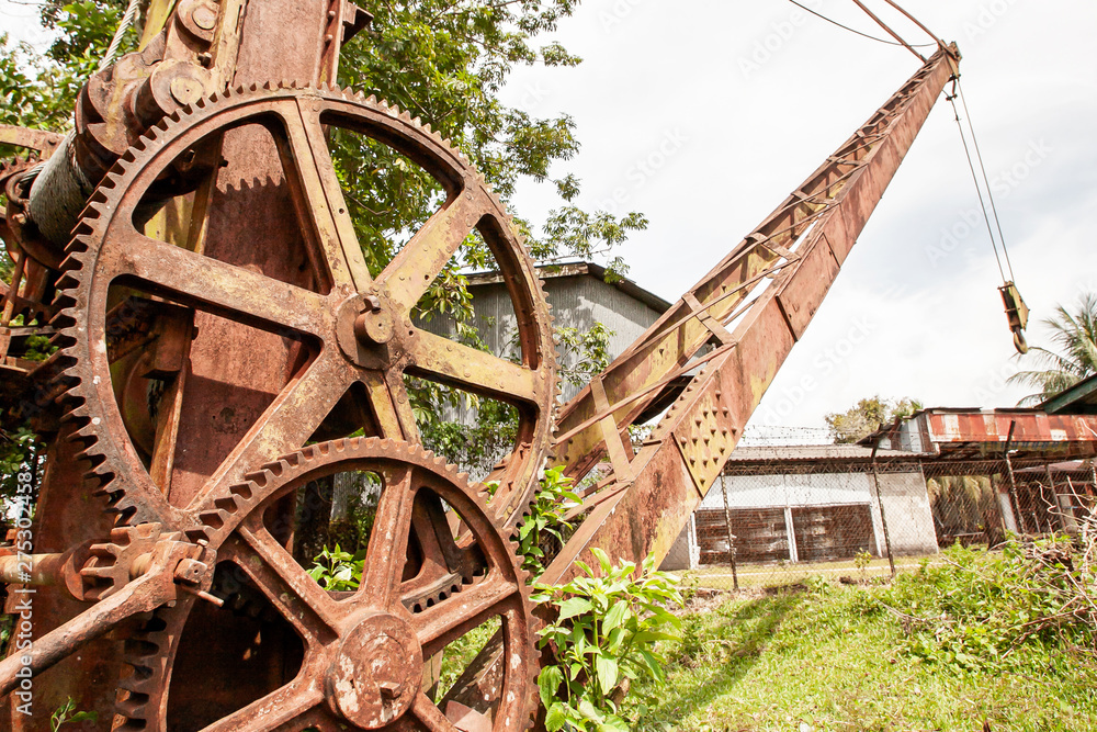 Wreck and rusty mining excavator in old abandoned tin mine.