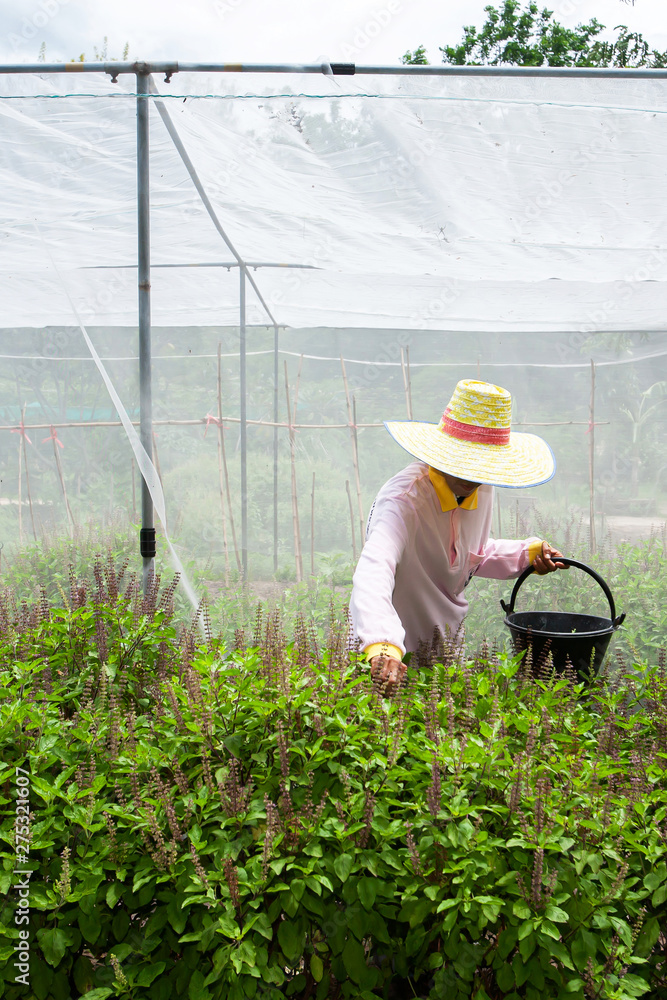 Asian female farmer plucking Holy Basil leaves in garden greenhouse.