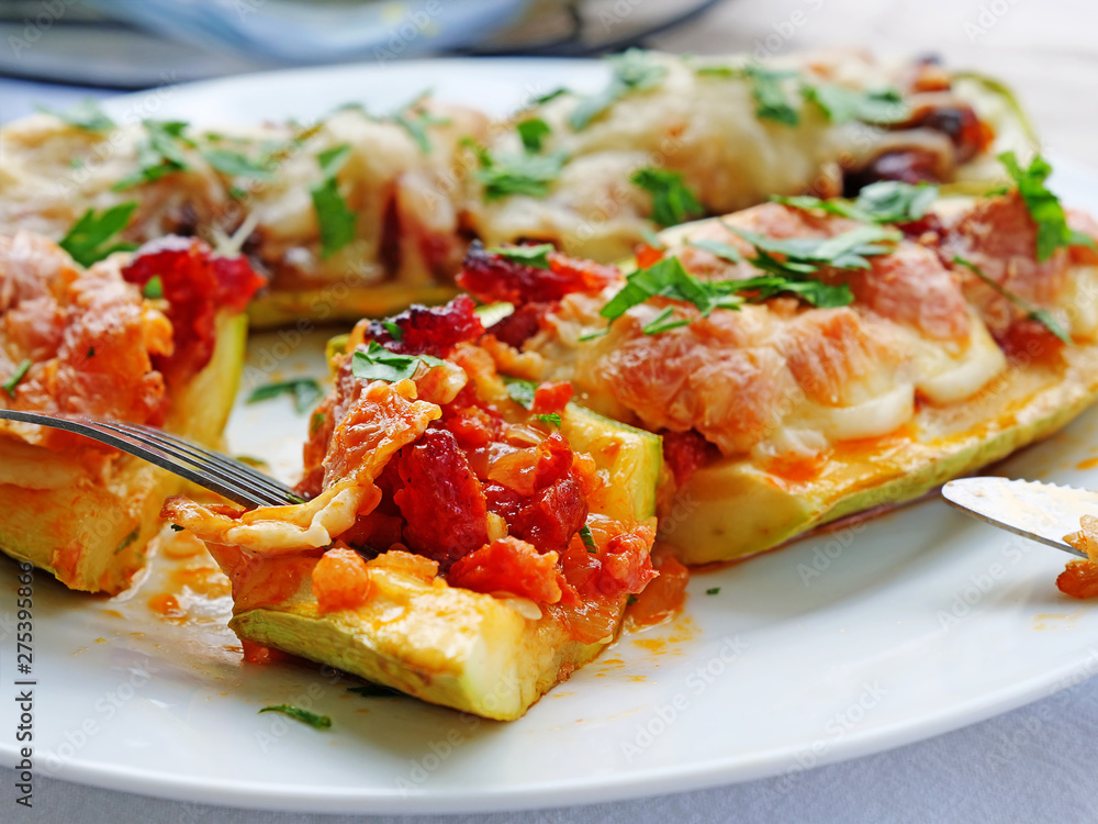 White zucchini stuffed with sausage, pizza filling and grated mozzarella cheese