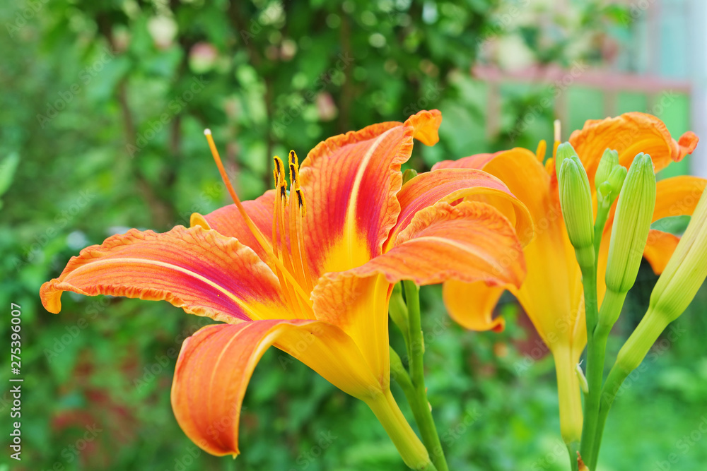 Orange daylily (Hemerocallis fulva) blooming in the garden