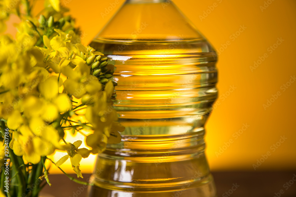 Rapeseed flowers and rapeseed oil in a bottle on the table