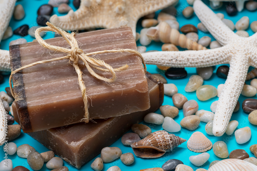 Handmade moisturizing Frankincense & Myrrh Goat's Milk Bar Soap decorated with small Pebbles, Sea Stars and Sea Shells on bright blue background.