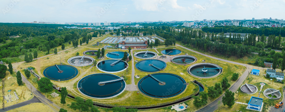 Modern sewage treatment plant, aerial view from drone