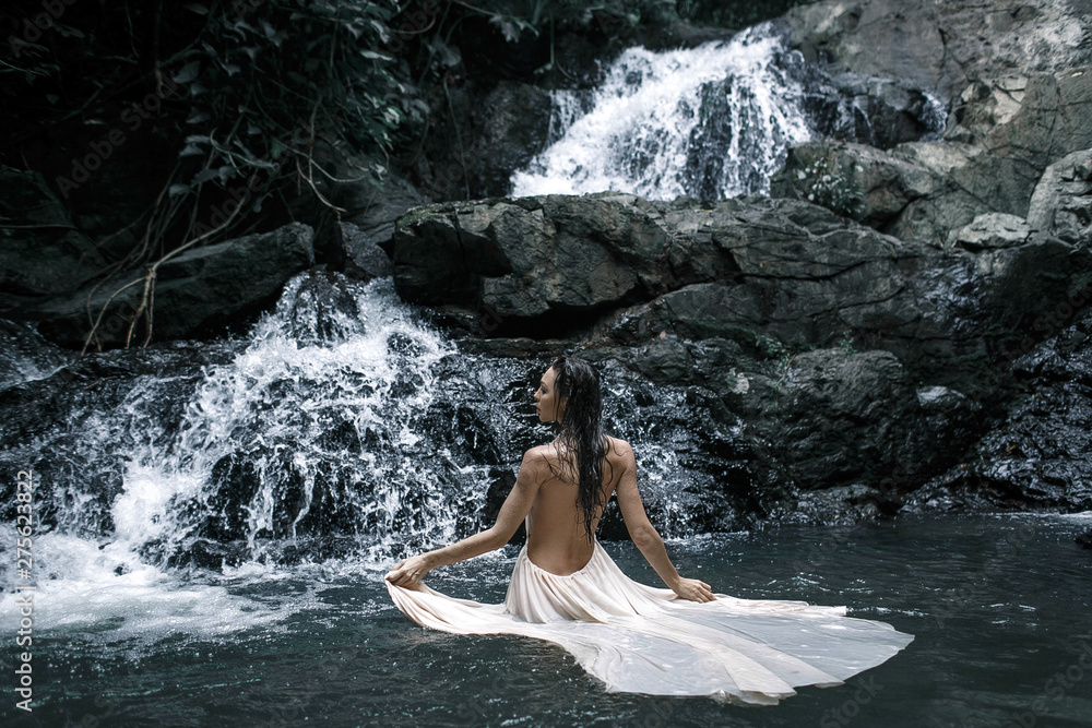 Portrait of the young Caucasian woman enjoying in front of a waterfall in an white evening dress. Back view
