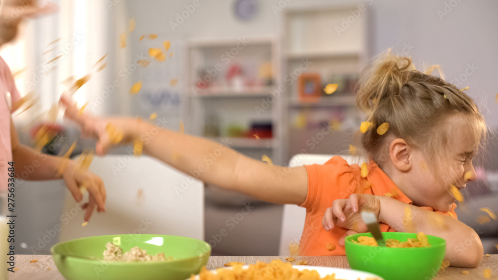 Happy little boy and girl throwing cornflakes at each other, having fun at home