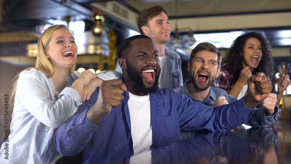 Black man with friends supporting sport team, rejoicing winning goal, victory