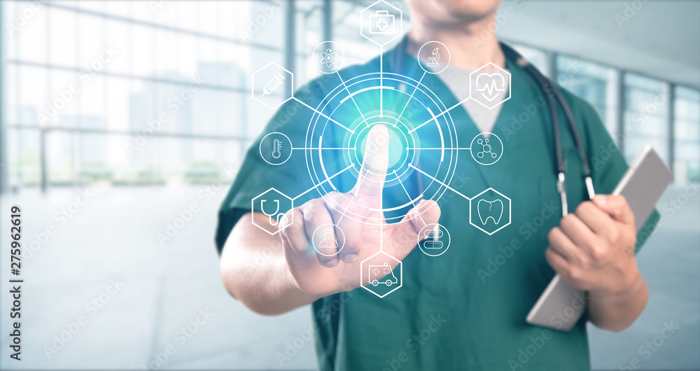 young doctor with hospital background