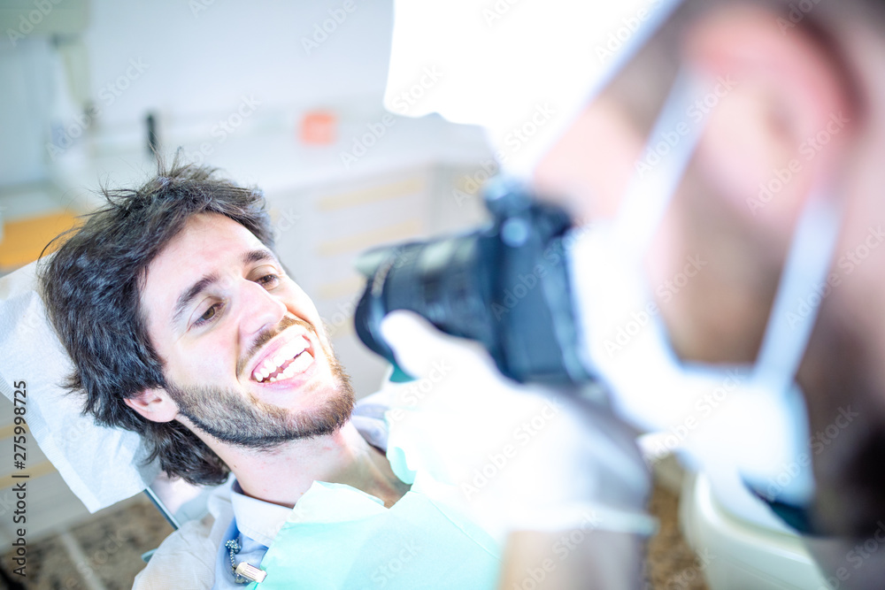 Fotografo odontoiatra per la fotografia della dentatura d un paziente sdraiato sulla poltrona.